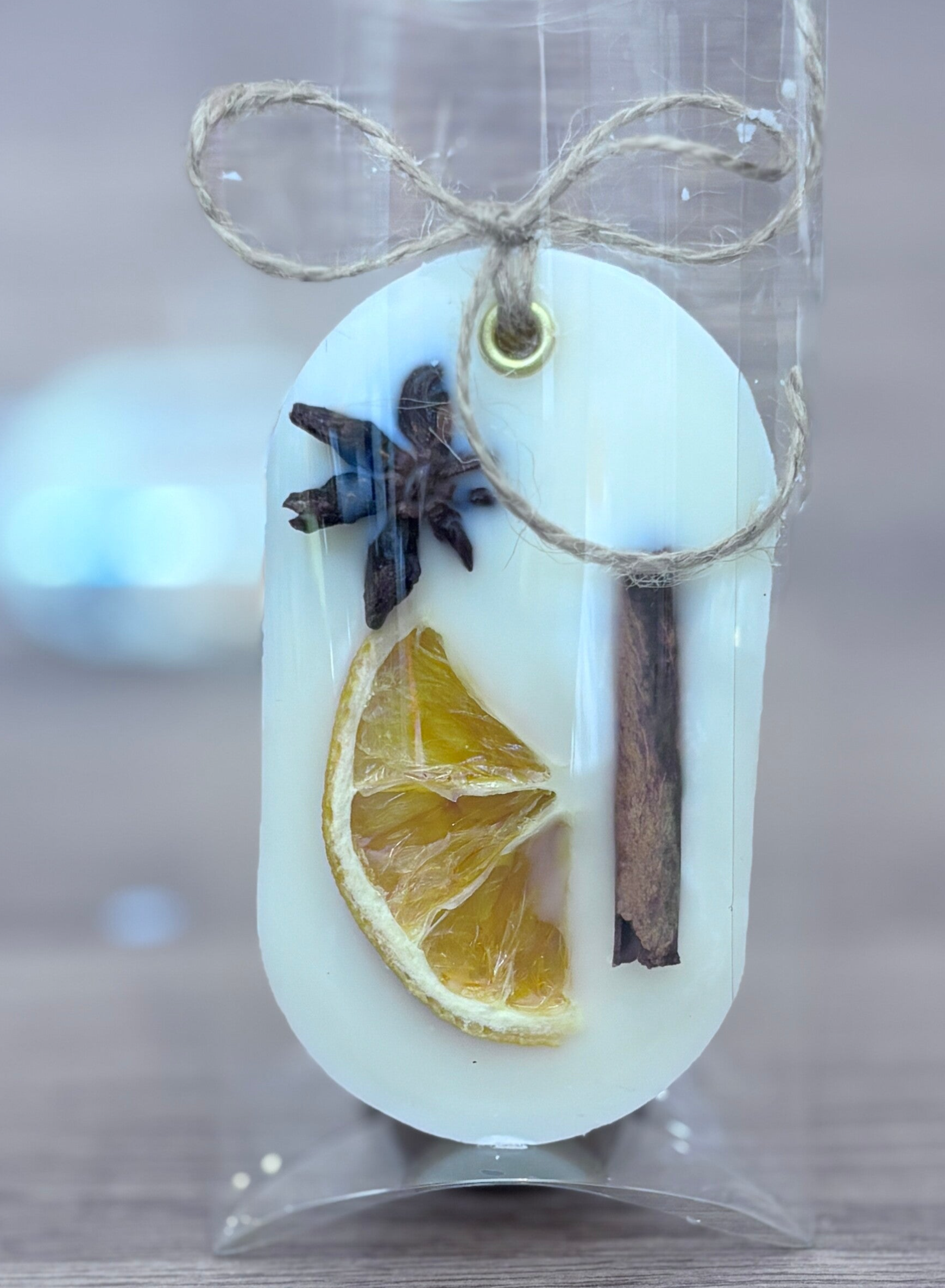 Hecha a mano con cera de soja, esta plaquita ambientador es ideal para perfumar armarios, cajones o cualquier rincón pequeño de la casa. Su decoración natural, con una ramita de canela, un anís estrellado y media rodaja de naranja seca, la convierte en un detalle tan bonito como aromático.