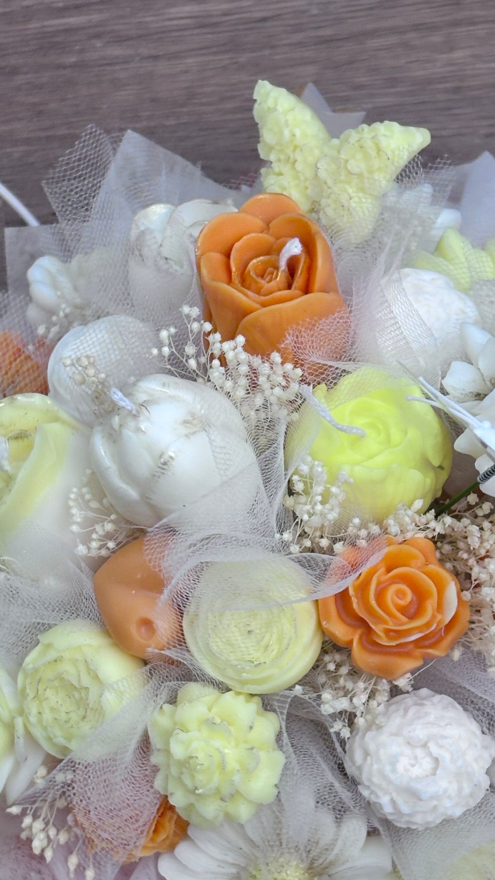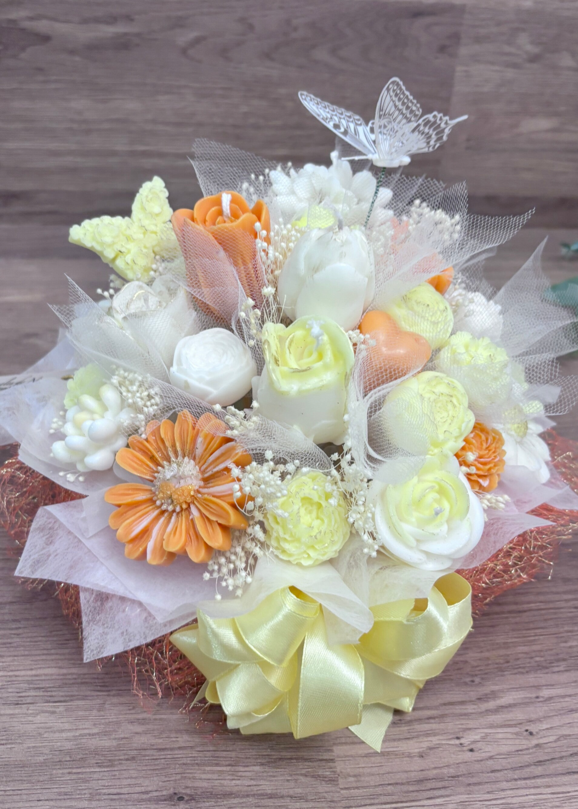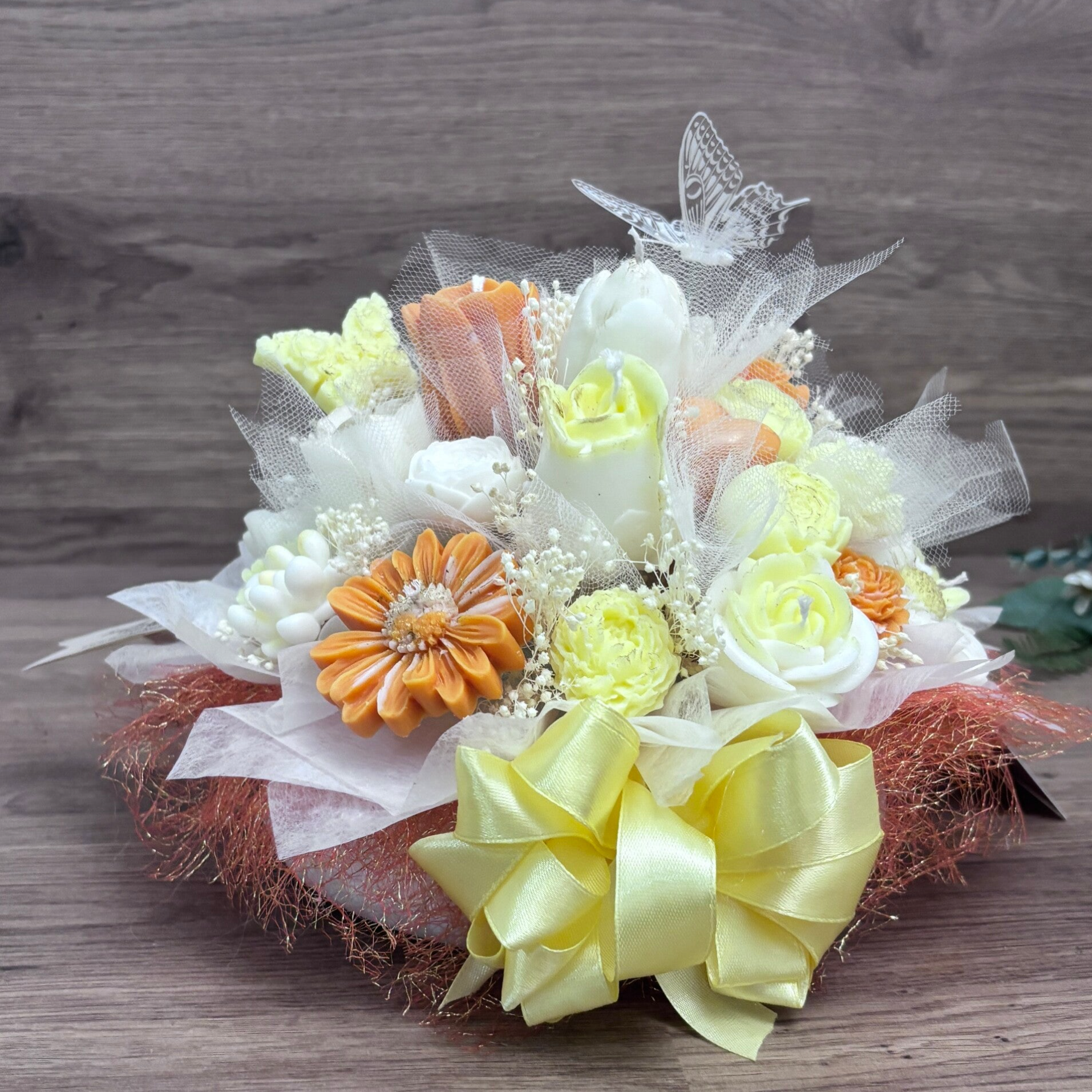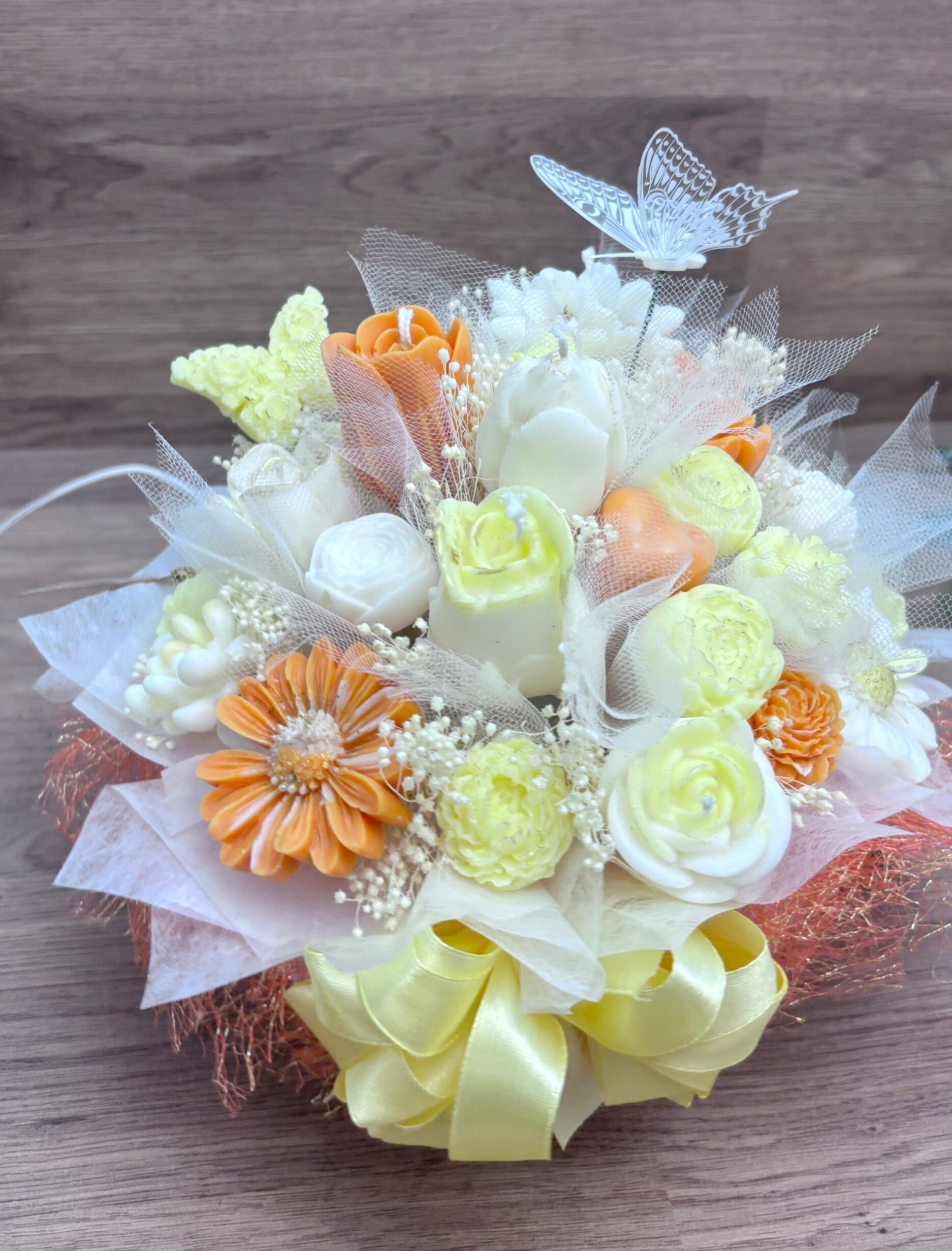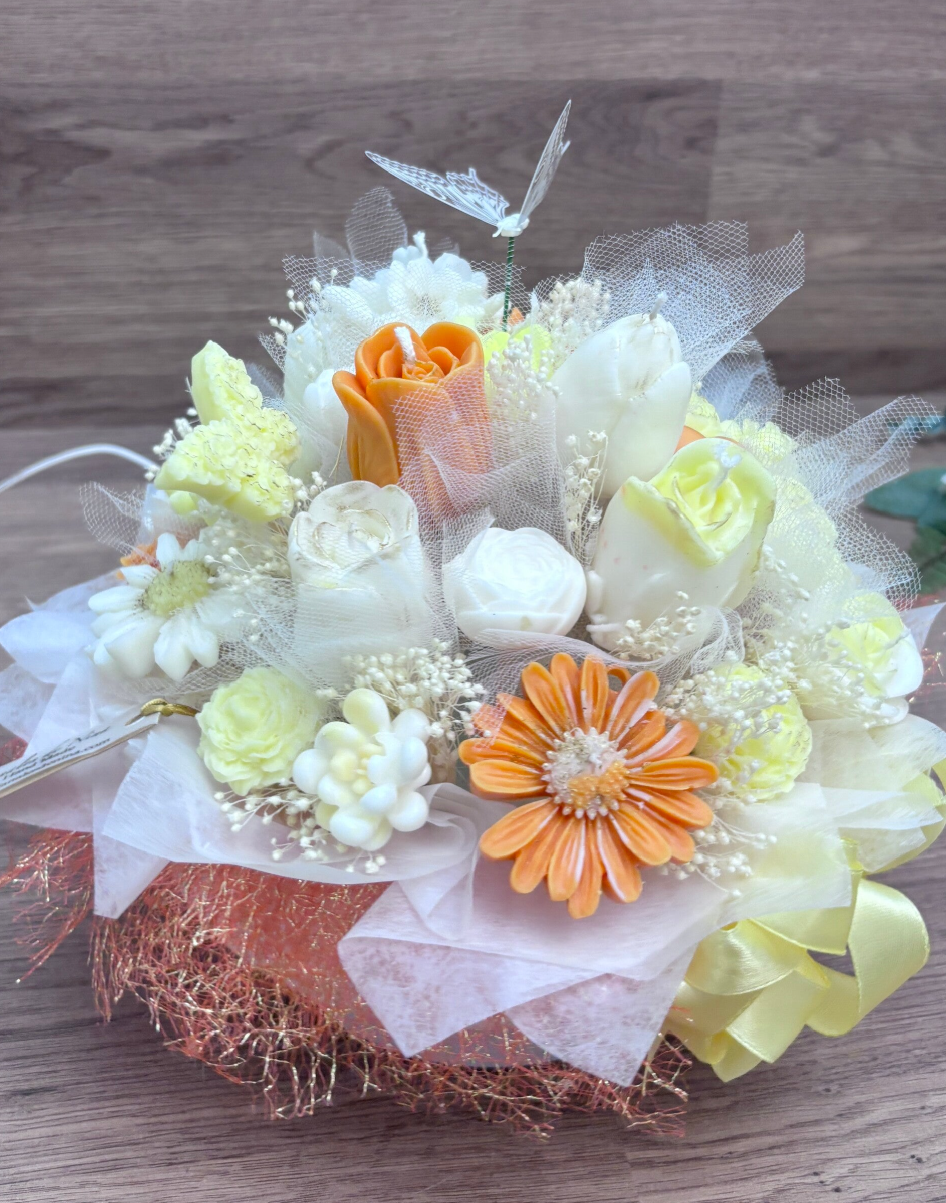 El ramo combina diferentes velas con forma de flor en tonos suaves crema, blanco y naranja claro, acompañadas por pequeñas flores decorativas y detalles ligeros que aportan movimiento y volumen a la composición. En la parte superior, un detalle de mariposas añade un toque simbólico de ligereza y transformación, reforzando el carácter especial de la pieza.
